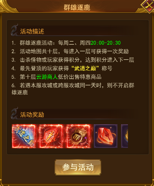 开放时间:每周二、周四20:00-20:30,若与本服/跨服攻城同天则不开启。