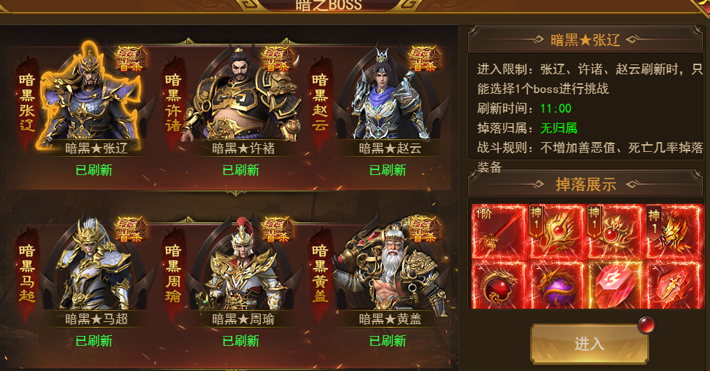 暗之boss 分为暗之张辽和暗之马超两大类,横着查阅,其中每一类有3个怪,刷新后只能选择对应一类其中一个怪进入击杀,无法击杀多个,可以根据奖励酌情考虑进入。