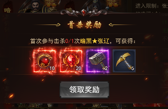 首次击杀或者协助同势力,可在进入页面领取首杀奖励。