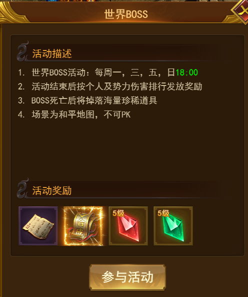 首先,咱们得清楚活动的时间安排。世界BOSS活动可是个定时大餐,每周一、三、五、日的18:00准时开宴!所以,各位小伙伴们,记得调好闹钟,别错过了这场盛宴哦!
