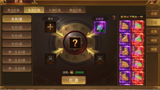 除了可以穿戴普通生肖外,我们还可以穿戴一套神·生肖,在生肖页面点击“凡”就可以查看神生肖。集齐神生肖鼠、牛、虎、兔、龙、蛇可激活神·迅捷效果,集齐神生肖马、羊、猴、鸡、狗、猪可激活神·反射效果。穿戴神生肖后,在攻击时都有几率将目标佩戴且低于自身的生肖击落,击落后需要重新穿戴。