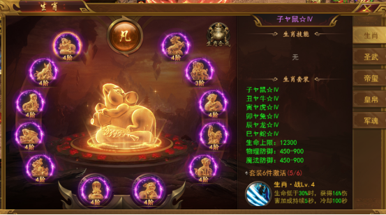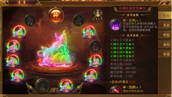首先,我们在点开圣装即可查看到当前穿戴的生肖装备。穿戴6件生肖鼠、牛、虎、兔、龙、蛇可激活生肖·战效果(生命低于百分比时,获得持续百分比的伤害加成);穿戴6件生肖马、羊、猴、鸡、狗、猪可激活生肖·御效果(生命低于百分比时,获得持续百分比的减伤效果)。穿戴的生肖装备还会提供基础属性,等级越高,属性越好。