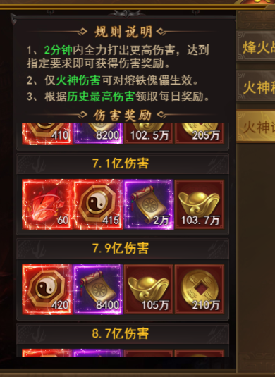 伤害要求:2分钟内全力输出,只要伤害达标就能拿对应奖励,而且只有火神伤害能对熔铁傀儡生效哦!