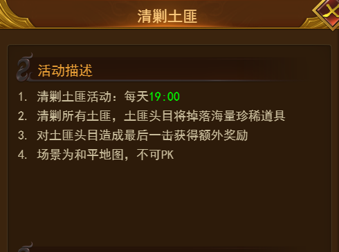 核心机制:活动场景为和平地图,全程禁止PK,放心大胆打土匪,不用怕被其他玩家搞心态!