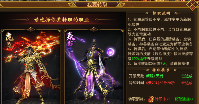 1、时机选择:当前处于新服开服第1天后,满足开服天数要求,可选择喜欢的职业转职。